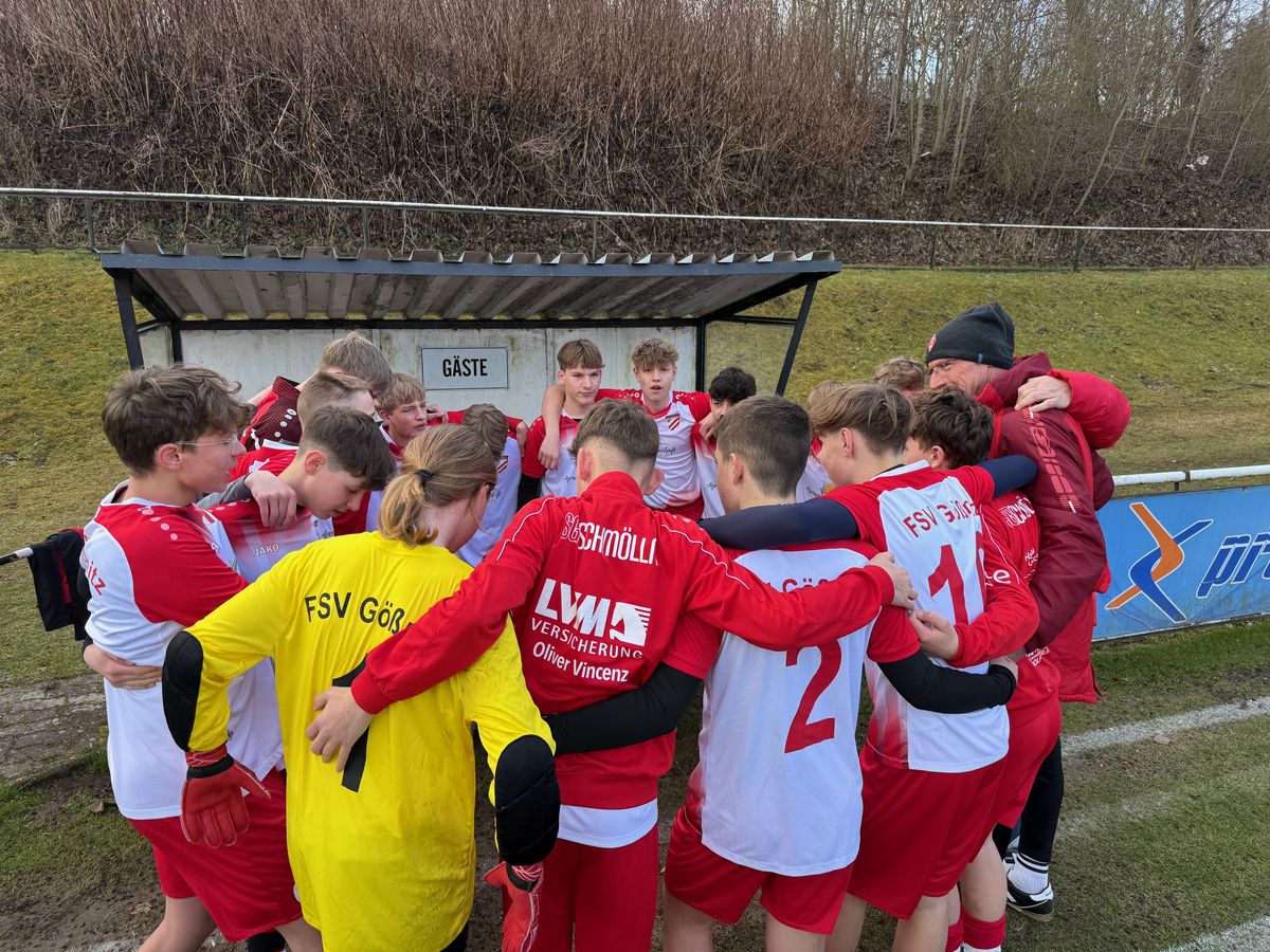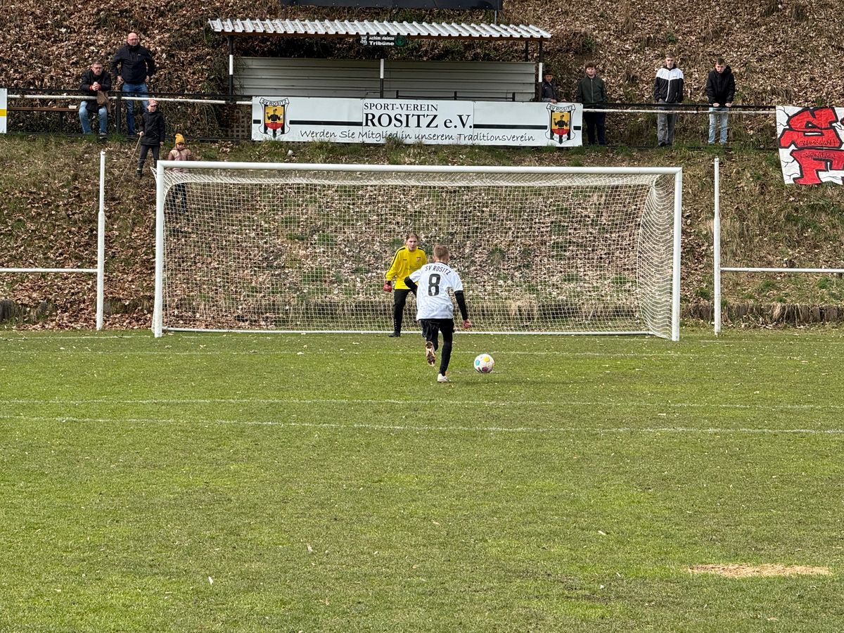 Die C1 Junioren der SpG Schmölln /Gößnitz hatten am Sonntag, den 29.03.2026, das Halbfinalspiel des Kreispokals Ost-Thüringen auf ihrem Spielprogramm. Der Gegner und Gastgeber dieses spannenden und hochklassigen Nachwuchsspiels, war der SV Rositz, im „LSS Sportpark Rositz“. Das Spiel, fand unter der Leitung, des guten agierenden Schiedsrichters Matthias Hahn statt, der auf beiden Seiten kleiner Vergehen umsichtig ahndete. Das Training stand diese Woche unter dem Motto „Halbfinalspiel“ und so war auch das Training ausgerichtet und die Spieler zeigten sich motiviert in den einzelnen Einheiten. Am Samstag vor dem Halbfinalspiel, gab es noch ein leichtes Training in Spielform, mit verschieden Aufgaben. Im Anschluss gab es für alle noch ein gemeinsames Abendessen und die Spielansprache mit der Aufgabenverteilung. Das Spiel begann am Sonntag, dann pünktlich um 10:30 Uhr, vor rund 90 Zuschauern. Beide Fanlager waren auf die Zuschauerzahl gleichmäßig verteilt, sodass auch unsere Mannschaft ihre Unterstützung erhielt. Die Spielansprache durch Lutz, an diesem Morgen war kurz und knapp. Die Spieler unseres Teams hatten die ersten 10 Minuten ihre Schwierigkeiten, sodass Rositz zu ersten sehr guten Torchancen kam und wir das Glück hatten, dass sie diese nicht in unserem Tor unterbringen konnten. Nach diesen Anfangsminuten konnte unser Mittelfeld, um Ben, Maxi v.C und Co, eine leichte Oberhand bekommen und damit unsere Angri e vorbereiten und wir kamen so zu ersten Torchancen, die aber meisten leichte Beute für den Torwart der Rositzer waren. Rositz agierte über die Gesamte Spielzeit aus der eigenen Hälfte mit weiten Bällen und überbrückte so das eigene Mittelfeld, um zu schnellen Torabschlüssen zu kommen. Unsere Abwehr stand oft im Eins gegen Eins, den Angreifen der Rositzer gegenüber und leisteten Schwerstarbeit. Vincent unser Anführer der Abwehr versuchte sein Bestes, um Ordnung in die Abwehrarbeit zu bekommen und das gelang in überwiegend. Das Spiel in der ersten Halbzeit war auf beiden Seiten gut und so kam es zu einem sehr abwechslungsreichen Spiel, dass für die Trainer auf beiden Seiten zum Nervenkitzel wurde, wer das erste Tor erzielt. So hatten wir zum Ende der ersten Halbzeit (35+1) einen Freistoß in der Hälfte des Gegners. Diesen Vorteil gaben wir, durch einen harmlosen Schuss auf das Tor aus der Hand, da der Torwart diesen lichten Ball aufnahm und sofort den Gegenangri einleitete mit einem Abschlag bis zur Mittellinie. Die Absicherung in der Abwehr war, bei uns nicht vorhanden und so konnte der Gegenspieler von Vincent ihn blocken und ein zweiter Rositzer Angreifer konnte frei auf unser Tor zulaufen und das 1:0 für Rositz erzielen. Der Halbzeitpfi folgte diesem Tor auf dem Fuß und es lag jetzt am Trainer Team die Mannschaft wieder aufzurichten und für die zweite Halbzeit vorzubereiten. Wir hatten in der ersten Hälfte unsere Chancen und jetzt musste diese noch in zählbares umgesetzt werden. Wir gingen unverändert in die zeite Halbzeit und ließen jetzt von Anbeginn, keinen Zweifel daran aufkommen, dass wir das Spiel gewinnen wollen. Wir erarbeiteten uns Chancen und es fehlte noch etwas an Genauigkeit. Mitte der zweiten Hälfte wechselten wir im Angri aus, um weitere Energie nach vorn zu bringen. Omar, Mika G. und Leopold versuchten so ihr Bestes und brachte die Abwehr der Rositzer in Verlegenheit. Es dauerte aber noch bis zur 63. Minute, bis ein schöner Pass auf Ben, ihn im Laufduell mit einem Gegenspieler erreichte und er diesen kontrollierte und mit einem schönen Lupfer über den herauseilenden Torwart ins Tor heben konnte. Die Freude war groß und das war die Belohnung für die gesamte Mannschaft, dass sie immer an sich glaubte. Das 1:1 wurde in den letzten Minuten der regulären Spielzeit auf beiden Seiten verwaltet und es geschah nicht mehr viel, so dass es jetzt in der Verlängerung ging. In der Verlängerung kam es beiden Seiten noch zu zwei Großchancen, die erste war Rositz vorbehalten, als ein Rositzer Angreifer in einen fahrlässig gespielten Pass zu Maxi Z. hinlief und unser Maxi diese 1zu1 Situation für sich entschied. Die zeiten Riesenchance hatte Omar, als er über die rechte Seite auf das Tor zulief und auch den Torwart überlupfte, aber leider das Tor um ca. 50cm verfehlte. Jetzt musste das Elfmeterschießen entscheiden und auch dieses wurde ein Nervenkitzel für beide Mannschaften. Unsere ersten fünf Schützen, waren sich sehr sicher, dass sie diese Verantwortung übernehmen wollen, aber gleich unser erster Schütze, scheiterte an den guten Torwart in diesem Moment. Es folgten dann Mika G., Arne, Omar und dieses Verwandelten sicher, wie auch die Rositzer Schützen. Nun lag es an Maxi Z., den fünften Elfmeter zu halten und er machte seiner Mannschaft diese Freude. Wir lagen zu diesem Zeitpunkt noch mit einem Tor hinten und unser letzter Schütze Roman, hatte nun die Aufgabe uns im Rennen, ums das Pokalfinale zu halten. Roman konnte der nervlichen Belastung standhalten und verwandelte zum Ausgleich im Elfmeterschießen. Jetzt ging es Spieler für Spieler weiter, bis einmal eine Mannschaft eine Elfmeterrunde für sich entscheiden konnte. Es schossen alle 11Spieler inklusive der Torhüter auf beiden Seiten und einen Sieger gab es nicht. Nach unserem Maxi Z. war eine Rositzer Spieler an der Reihe und Maxi im Tor konnte diesen Elfmeter halten. Es Stand 11:11 n.E. zu diesem Zeitpunkt und es musste nun unser verletzt ausgewechselter Leopold zum Elfmeterpunkt. Er verwandelte seinen Schuss unhaltbar zum viel Umjubelten 11:12 n.E. für unsere SpG Jungs. Fazit: Jungs, das war eine geschlossene Mannschaftsleitung. Erhaltet euch die Motivation, die Leidenschaft und den Kampfeswillen, dann holen wir uns auch den Pokal.